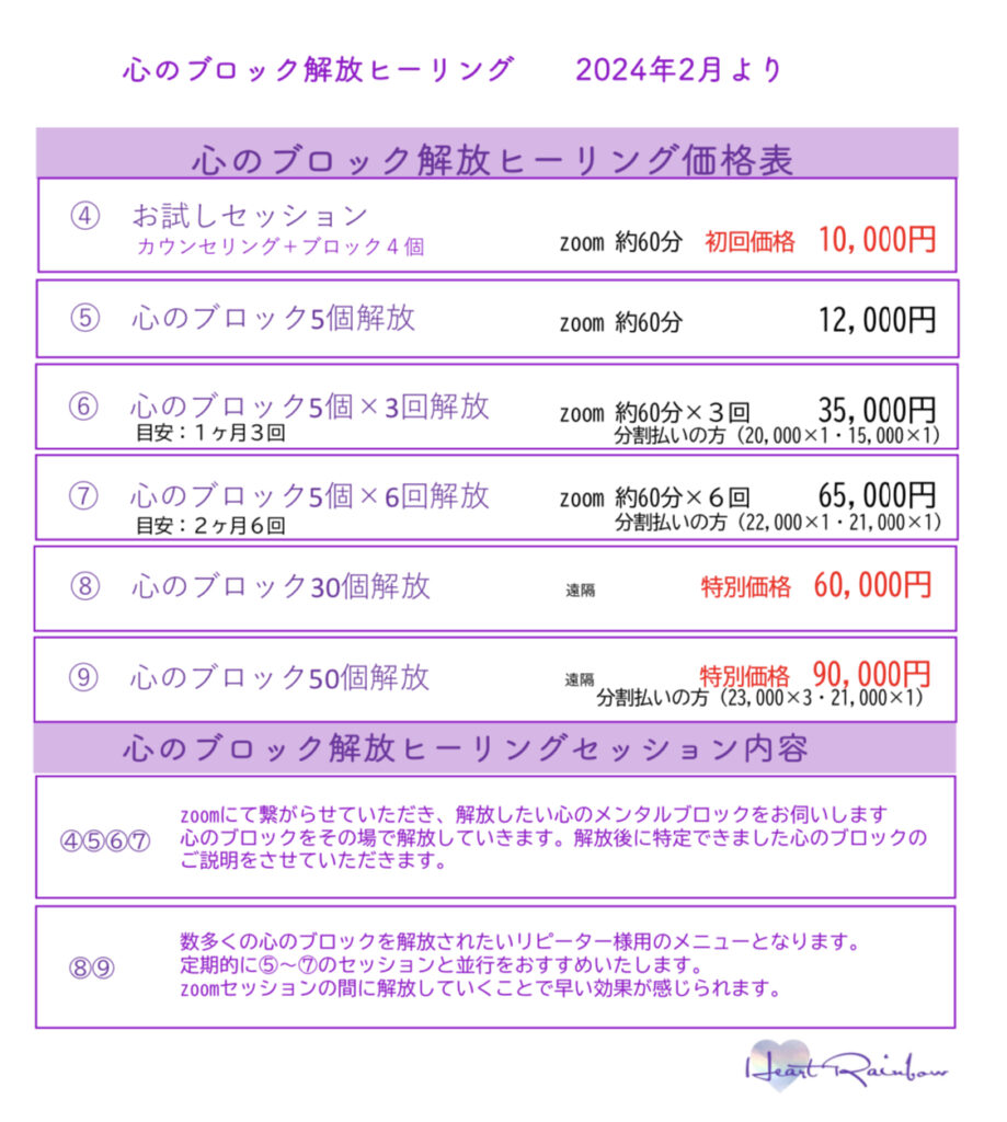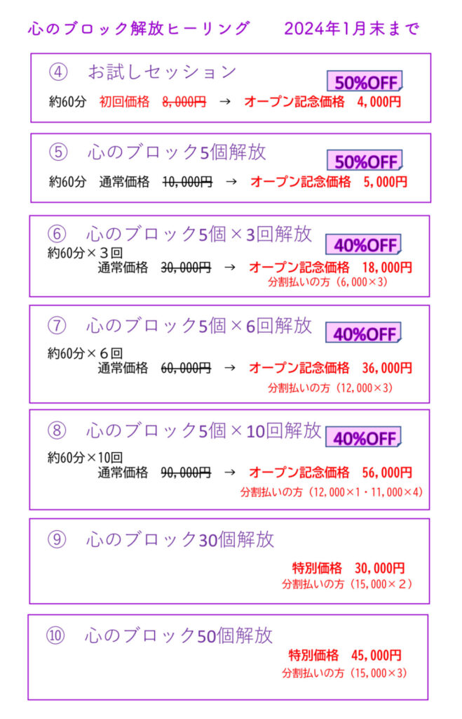 ※ ④のお試しセッションはカウンセリング+心のブロックを2個解放いたします。