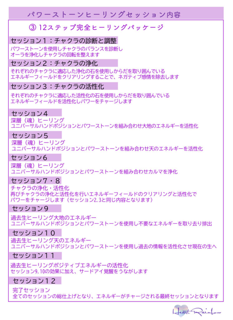 2ヶ月コース、3ヶ月コースはヒーリングの組み合わせにプラスして、ご自身で心の問題が解決できる各種ワークを実践していただくことで短期間で生まれ変わります。3ヶ月コースは2ヶ月コースに加えて、heart rainbowページ内の資料にアクセスしていただき、脳や脳内ホルモンの働き、ストレスの原因、周波数と波動エネルギー、感情の周波数や感情の考え方など、心について学んでいただけるコースとなっております。