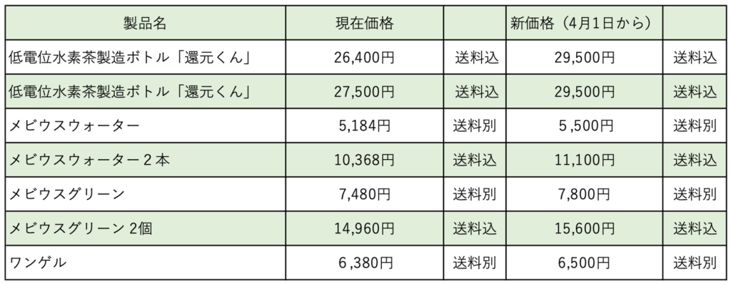 ※2026年4月1日よりメーカー販売価格が変更となります。(変更済み)還元くん、メビウスウォーター、ワンゲル、メビウスグリーンは3月28日までのお申し込みは旧価格にてご対応が可能です。