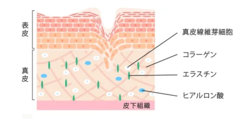 線維芽細胞が増える。コラーゲン(ハリ)、エラスチン(弾力)、ヒアルロン酸(潤い)
