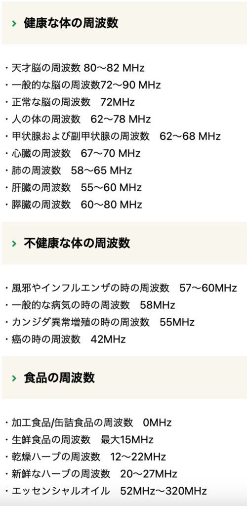 本来の周波数からずれてしまっている状態に対し、本来身体が持っている固有の周波数と同じ周波数帯の食べ物を摂取したり、パワーストーンを身につけたり、ソルフェジオ周波数などで音の『共鳴』をおこすことで乱れていたものが正常な周波数へともどっていきます。