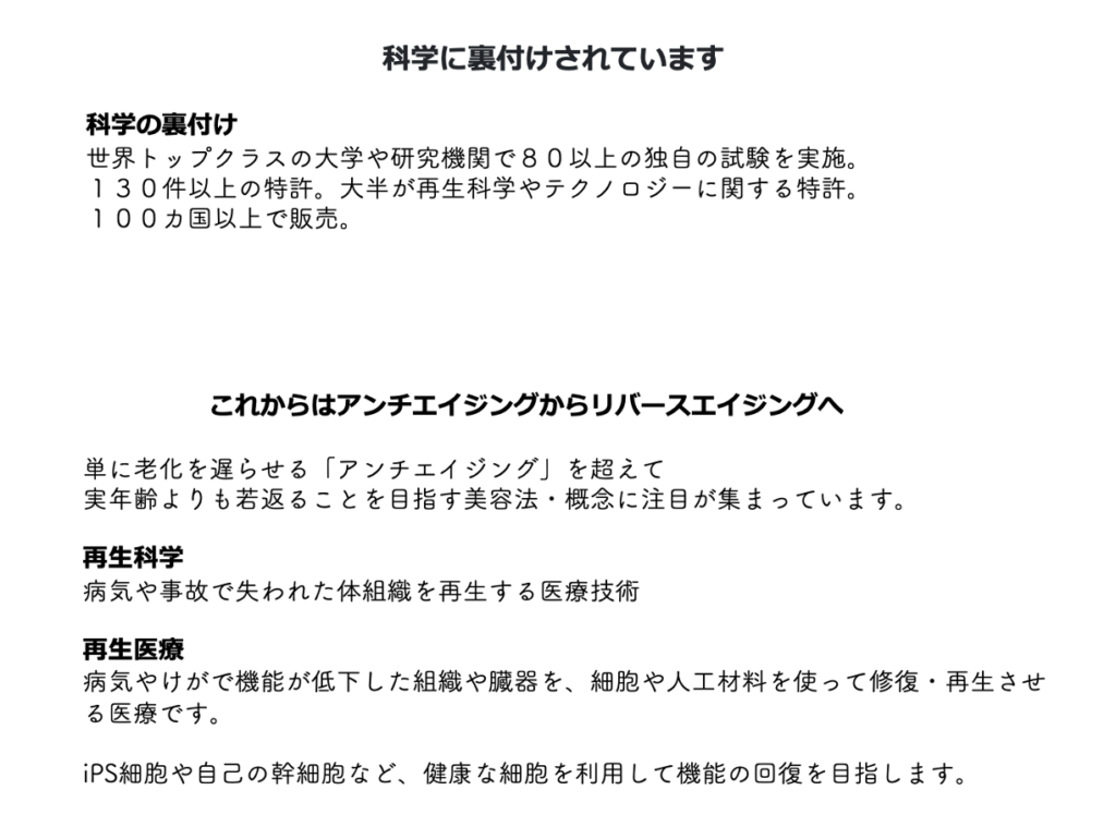 幹細胞配合サプリメントは、日本の法律で厳しく規制されており、幹細胞入りと謳われているサプリメントは厳密に言うと幹細胞は入っていなく幹細胞の培養液(ヒト幹細胞の培養液ではなく、植物幹細胞の培養液)注射は2万円くらいから