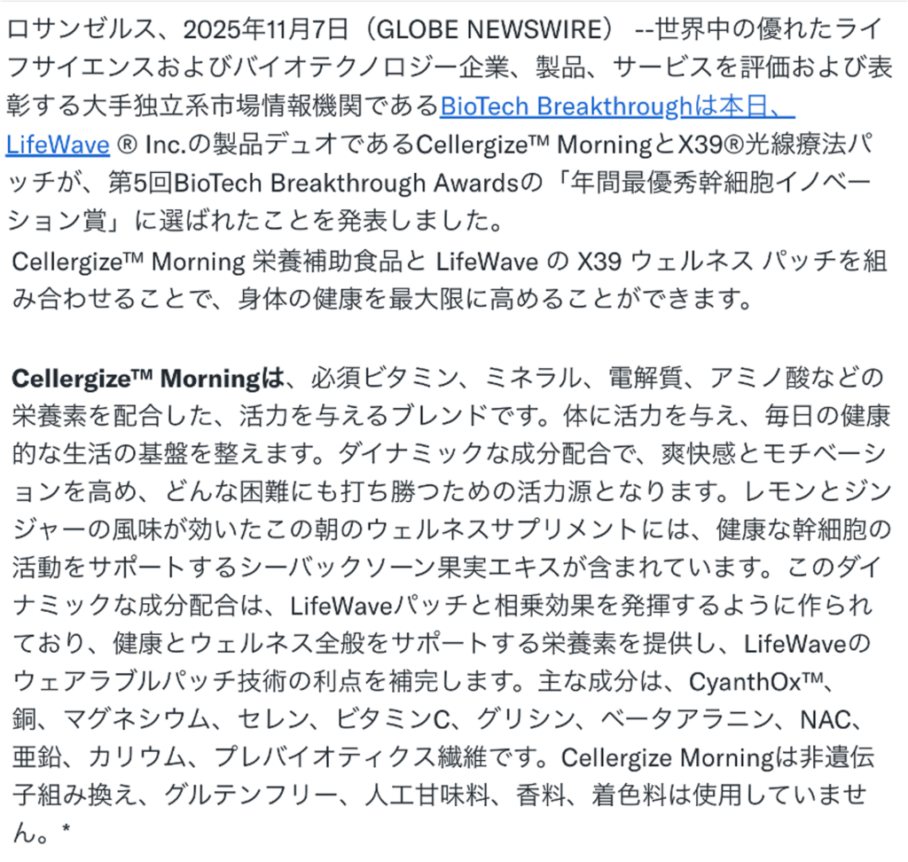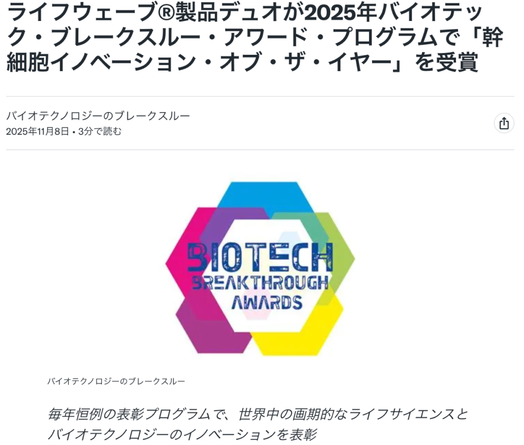 ライフウエーブがバイオテック ブレークスルー アワードを受賞