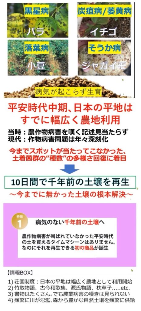 植物が健康に病気無く育つのに必要な土表面の変化には3日間、深さ10cm程度までの範囲に多様なバクテリアが住み始め健康な土に生まれ変わるまでに10日間、30cm以上の深さまで黒土化が進む効果までに平均半年間となります。