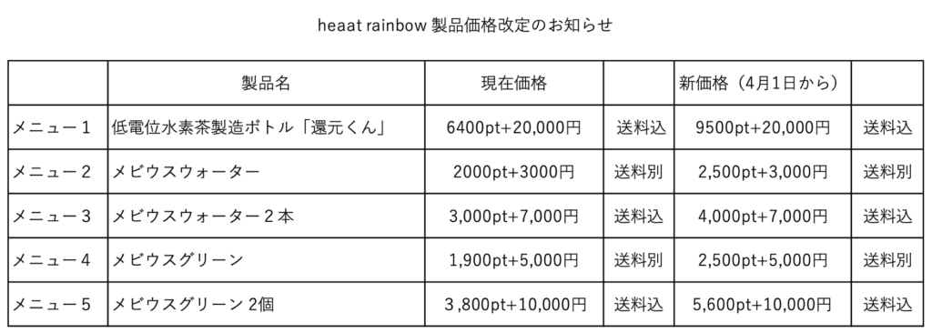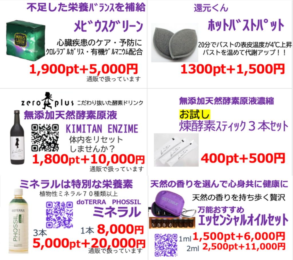 ・物販:還元くん、メビウスウォーター、煉酵素スティックを持参いたします