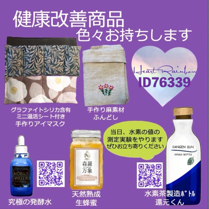 ・還元くん、メビウスウォーター、天山蜂蜜、ホットアイマスク、麻製ふんどし、他