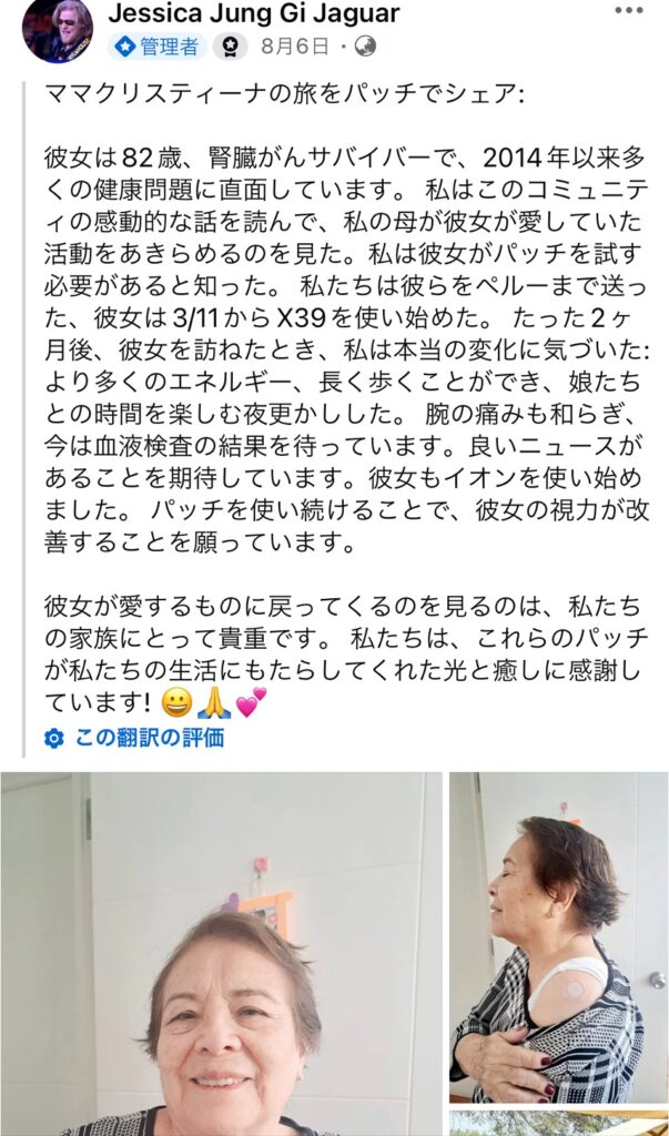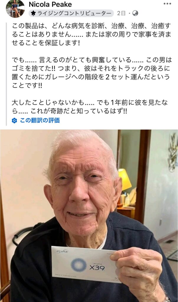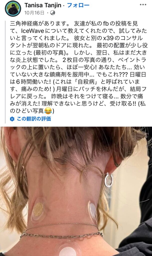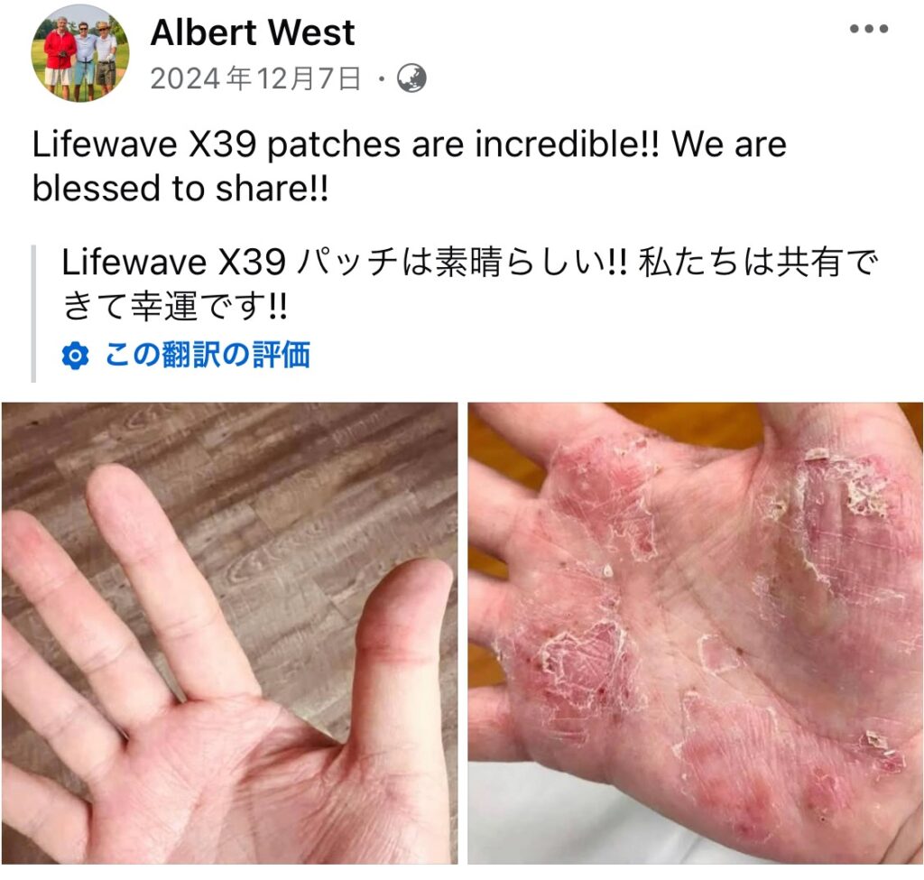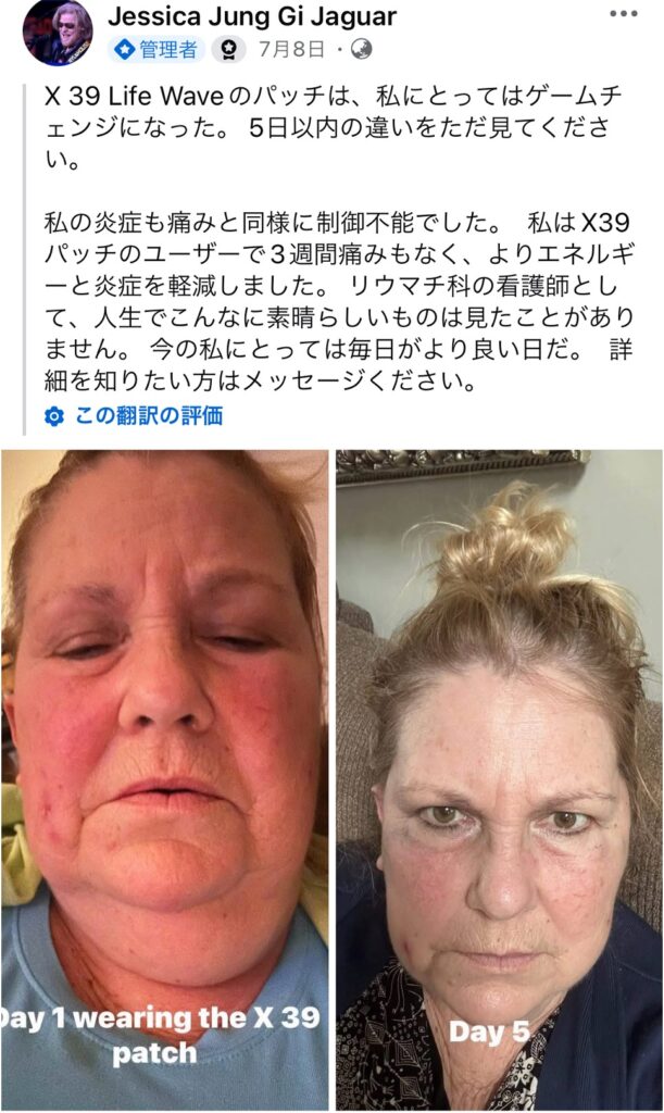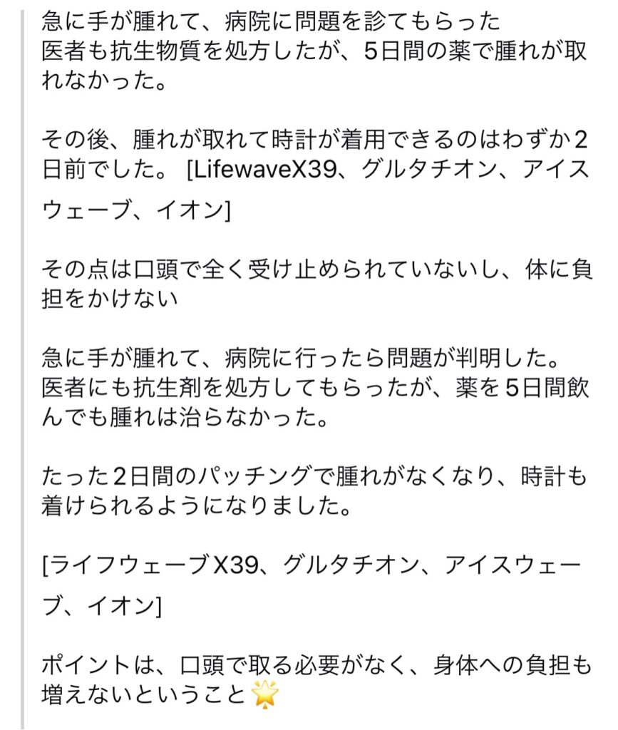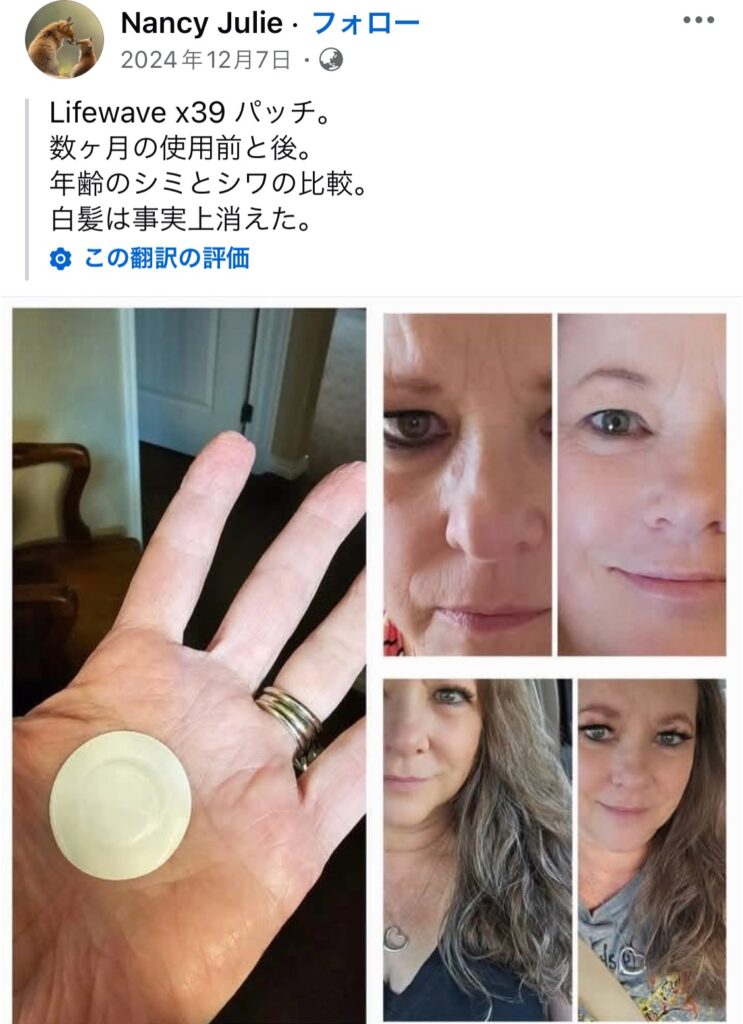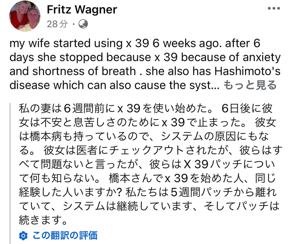 ライフウエーブパッチX39製品のフェイスブックに投稿された使用者からの報告の抜粋ページとなります。